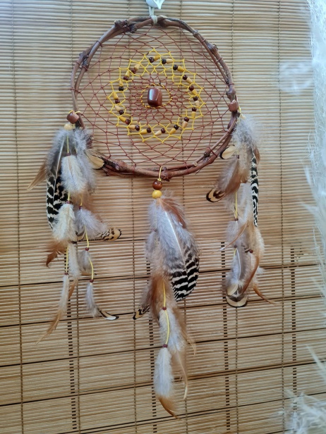 Tu choisis la pierre centrale, la couleur des fils, le type de bois, les plumes et l'énergie que tu souhaites y retranscrire, et je crée pour toi selon tes envies et tes choix, connectée à ce que je perçois.