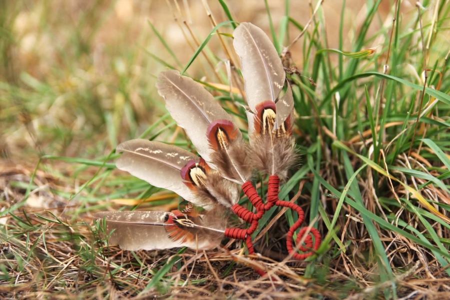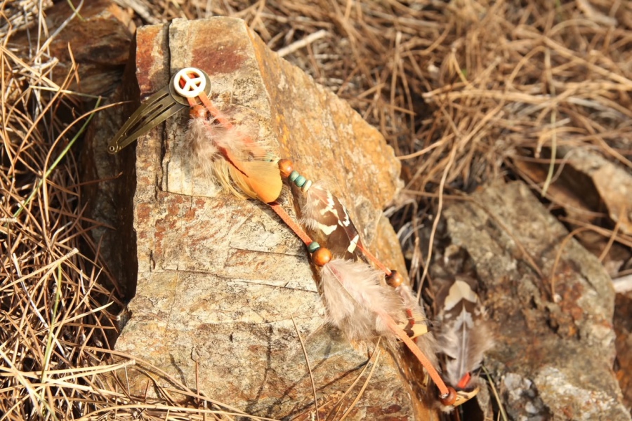 Bijou de plumes de festival, d'évenement ou de cérémonie chamanique, à porter derrière l'oreille.
