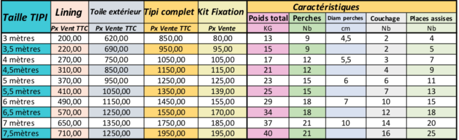 les prix ne tiennent pas compte des frais d'envoie qui sont de 20 à 40€ euros/tipi suivant la taille.
